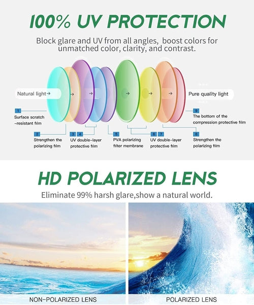 - Features: Polarized: Polarized lenses eliminate or reduce glare. Our lenses are specially designed to offer 100% UVA and UVB protection even in intense lighting conditions. Without polarized protection, depth perception is reduced, distorted view and color perception occur, and in some cases, you could be temporarily blinded. Polarization is useful for many outdoor activities including driving, extreme sports, water sports, and fishing. The benefits of polarized sunglasses are endless and can save your vision!
